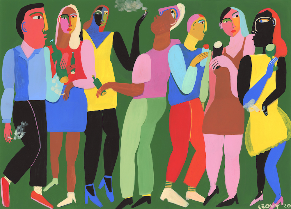 Ana Leovy’s glass is half full, effervescent with bubbles, ready to toast the day and share the good news. Maybe on a solo stroll, maybe with friends and neighbors, the message is clear in her ripe gouache and acrylic pictures. Follow the light like a sunflower, lounge proud with purpose. A tropical storm delayed our conversation, but didn’t dampen her spirits.