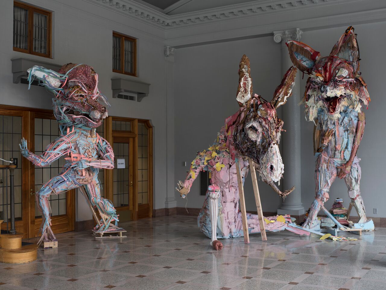 Elisabeth Higgins O’Connor: Well, Tom Waits is definitely an influence! For this body of work, I have been working more from drawings and maquettes, building wood skeletal armatures and laminating foam insulation sheets into giant cubes, then carving them into the foundations for the bodies and heads. Previous work either accreted like a pearl, with bedding, cardboard and all manner of glues, drywall screws and paint, or were hollow, many-layered cardboard constructions, and had become prohibitively heavy, unwieldy, and after time, tended to deflate or deform during transport and storage. I normally work very intuitively, and will follow a form toward what it might suggest to me. Something that I perceive as dog-like might morph eventually into something sheep-like, for example.