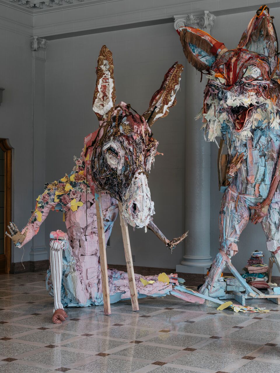 There are no better words to describe the impact of a colossal Elisabeth Higgins O’Connor sculpture aside from her own. Her resilient figures lumber into the world with a powerful clash of juxtapositions, comfy in their awkwardness and inability to hide, sweet and scrappy, steady and wild; they’re just like you. For anyone who’s ever had to bounce back or pull themselves up by their bootstraps, (e.g., everyone), these sculptures gently reach out and connect. They are alive with the history that made them, and their gestures suggest a triumphant rebound from whatever metaphorical pile of crap they’ve had to wade through. Constructed of familiar materials and towering precariously, you won’t know whether to hug them or run from them—an acute mirror of life’s everyday interactions.