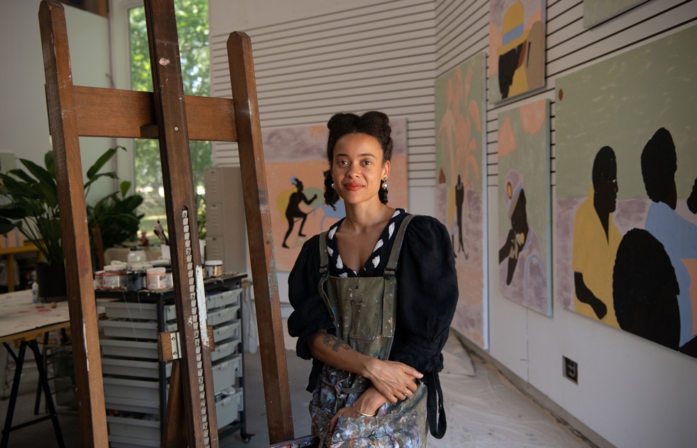 There’s a van Gogh painting, Rest from Work (After Millet), with two figures on a haystack. His use of color and gestural strokes helped educate me, since I don’t have a formal background in painting. I can find amazing material in bookshops about the history of painting and how artists have been inspired by culture—like Giacometti, with his sculptures that have a primitive essence, or Picasso with the masks. Painting is this assemblage of ideas that come through me, and I lay them out in a way where the narrative is honest to what I want to portray.