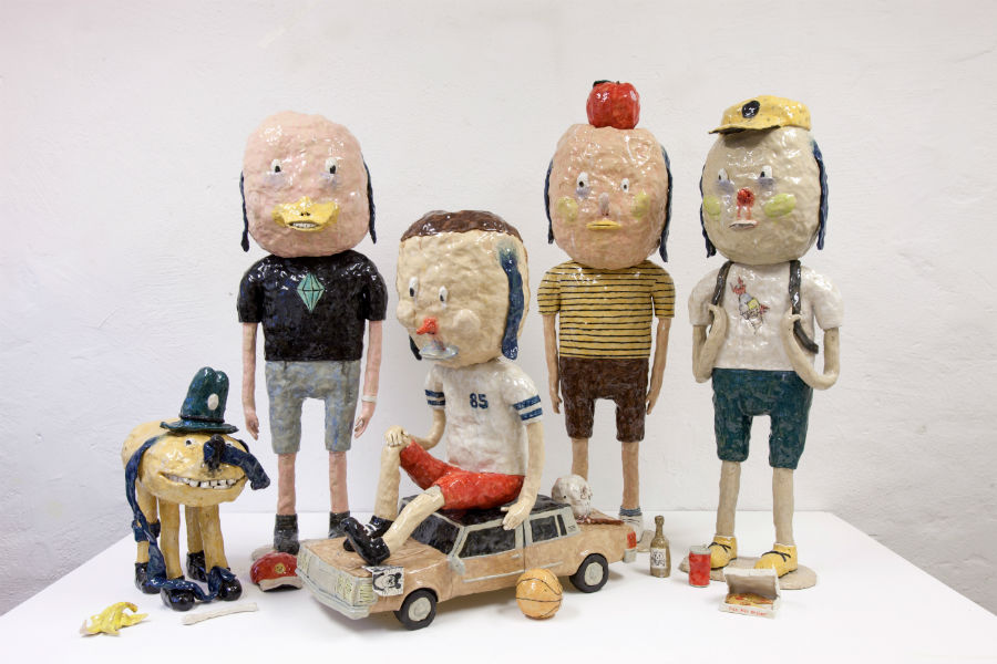 Swedish artist Joakim Ojanen has created an entire universe packed with a diverse army of endearingly gloomy characters. His own Les Misérables, if you will. Over the past couple of years, these oddballs and their pet companions, sculpted in ceramic and painted in oils, quietly enjoy a pensive sadness while keeping their native cool. The life of these mavericks isn't an exciting one, but they are content—they hang out alone or in squads, occasionally read a book, draw, play, or have a cheeky beer or cigarette. So mundane, yet so lovable, they are cheery monuments to melancholy and its quirky beauty.