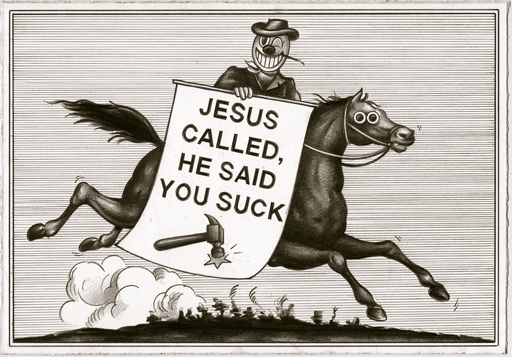 Oh my god. My dad, he teaches vacation bible school for fourth grade. He does this lesson on pursuing what you want to do in life as part of the curriculum, and he always shows some of my work. He was over for dinner a couple weeks ago and said he was going to show a drawing that I just posted. It’s this bird in front of a window, but the shadow that’s cast on the wall is a huge cock. He totally missed it. I was like, “Please don’t show that to your fourth grade bible class.” He’s just a regular dude, but when I was growing up, he would pretend to avert his eyes when there were breasts on the screen and say, “That’s unnecessary. Don’t you guys think that’s unnecessary?” But also he was the source of the first boob magazine I saw, which was stashed somewhere in his belongings.