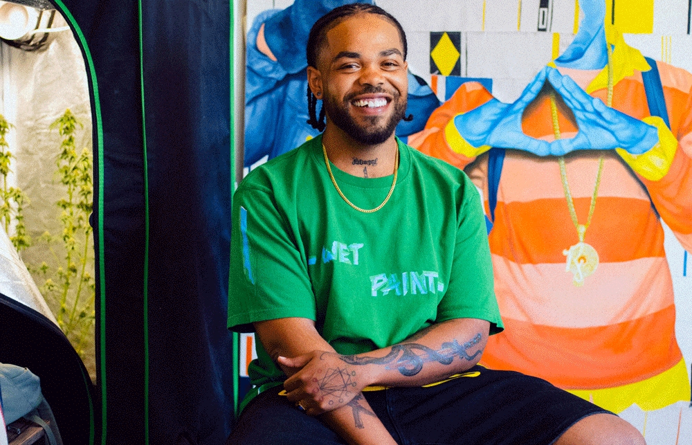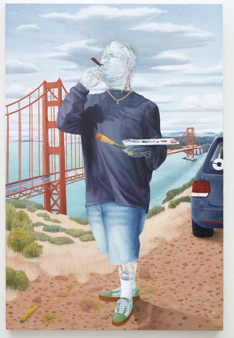 At first glance, the Slanguage series appears to be a playful confetti of pop culture and simple everyday life. Bart Simpson joyously dances down the aisles of a grocery store, a Smurf snoozes on a pile of cabbage, and Sponge Bob dutifully mops the floor. For Troy Lamarr Chew II, the LA-based, SF-trained painter, these works serve as a place for pop and still life iconography to celebrate lyricism and choreography, employing hip-hop sayings and the history of dance to create compositions that vividly portray a deeper sense of how cultures present themselves. In his show this past winter at Altman Siegel in San Francisco, The Roof is On Fire, viewers could download an app to actually see, on top of the paintings, the dances that Chew was painting, the different poses where he captures his characters in motion. It was innovative and playful, but also, a psychological study of what we see and how we see art in the 21st century.
