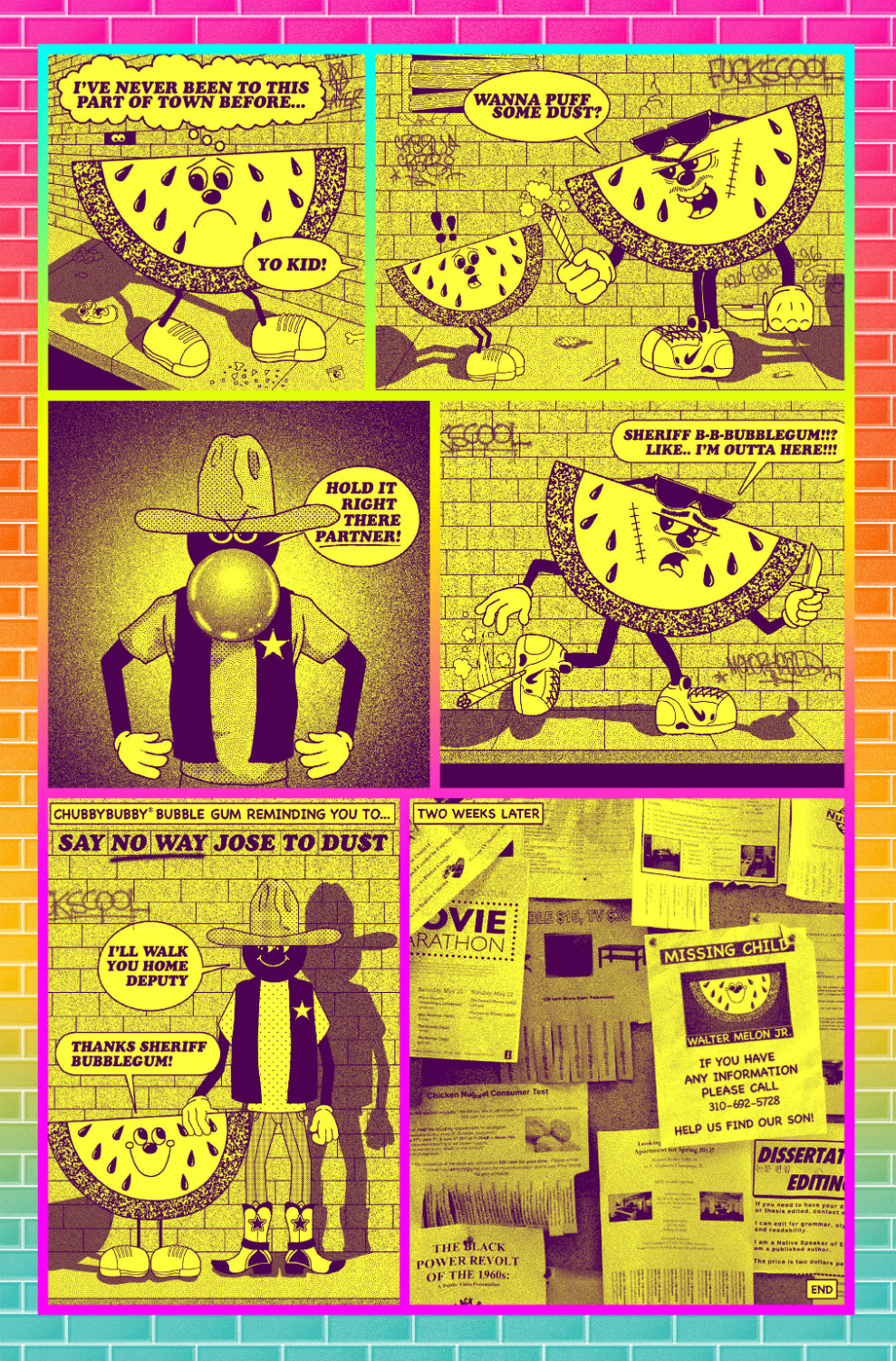 “Much like zines,” Josh tells me, “my favorite aspect of animation is the medium’s inherent accessibility. Cartoons utilize a basic language that can be understood by children and adults alike, regardless of their background.” Josh’s output doesn’t simply idle outside his day job. His humorous, playful and frequently capricious imagery comes in the form of zines, T-shirts, Risograph prints, stickers, pins and whatever else he can print on. His web store’s title, a personal favorite, is aptly named Future Trash Worldwide. Starting 2016 off with a bang, he attracted the attention of the big kids at Adult Swim, who invited him to create work for the shows Mr. Pickles and Rick and Morty. For all the enjoyment he’s brought me, I’m pleased to facilitate Josh’s first in-print interview so that his work can reach a wider, appreciative audience. —Austin McManus