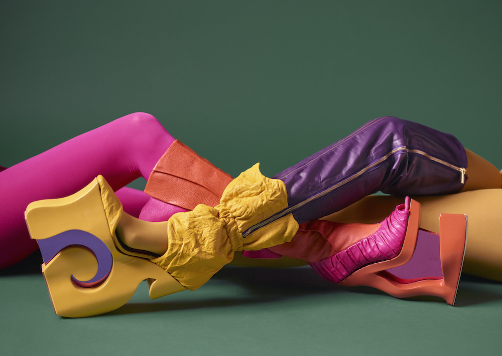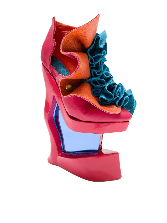 “My background is in marketing, and sketching footwear can be tough,” Footwear and Accessories Coordinator Damion Chappelain describes the goal as fusion of utility and design, of weighing the properties of those cousins, Form and Function. In her case, sketching was just part of Quintao’s challenge. The educational, and very inspirational, advantage of attending a school made up of so many departments has enabled her to learn new methods and crafts, as she recalls, “I could navigate between areas. I was able to make my own heels and handles with the Industrial Design department. I was stoked to see them teaching me so many skills.” The ability, personally, to 3D-print her visions has resulted in the very colorful double-mushroom fantasies she loves to drape and design. Whimsical and mysterious, the fungi shape offers infinite possibilities, while the properties of leather replicate the durability and aesthetics of animal-based hides. Maybe mushrooms really are symbols of good luck and prosperity because Bell Quintao seems to have succeeded: “It was very important that my instructor encouraged me to experiment with the complex designs I had in mind. He really pushed me, and we chatted about different techniques and possibilities. Having someone from the industry with so much experience was incredible. And the music at the footwear studio was always very exciting. Having a fun environment makes a huge difference, and I miss that.” —Gwynned Vitello