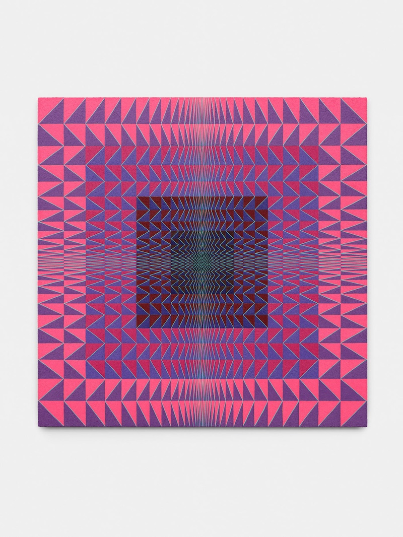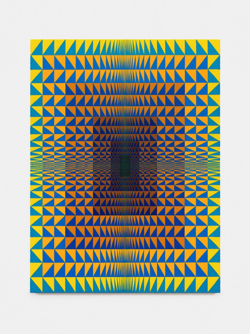 For Soumahoro, the connection between these visions of the French riviera and the final artworks is one lensed through a meticulous studio practice rooted in the artist’s own color theory research. The basis of his working procedure consists of countless self-produced graphs and diagrams of chromatic relationships, as well as a vast library of preliminary pattern documentation. Paints are all individually mixed according to precise gradations of value and saturation, while triangles, the primary building blocks of Soumahoro’s formal vocabulary, are mapped onto his canvases in radiating rectangles of repeated patterns of compression and distension that produce a wavelike effect. Only when Soumahoro adds the final triangles and his painted surfaces are complete is the final character of the works revealed: tranquil, reverberant, introspective.