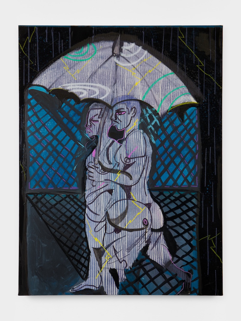 Jonathan Lyndon Chase's work is a vivacious exploration of identity. In his past works, there was a unique ability to blur boundaries between figuration and abstraction, deftly bringing forth the intimate and often unseen layers of human existence. In Downpour, at Sadie Coles in London, Chase is being his most bold, his characters like superheroes in their world, ultimately forging a vibrant testament to the continually evolving narrative of contemporary Black art, but also comic book and narrative art. With every brushstroke, Chase crafts a world both expansive and intricately detailed, affirming the art of storytelling in its most dynamic form. —Evan Pricco