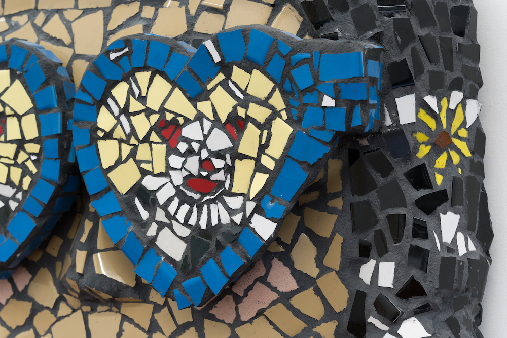 As a graffiti writer and what we can refer to as a "drifter", Elberto Muller has seen some things. Sure, we can all claim to see things, but for someone like Muller, whose "work draws from his experiences riding freight trains, planes and autos across North America, crossing and recrossing the country through a covert network of rail and road maps, resources and guides maintained by fellow travelers," fragments of a whole begin to take shape. The mosaic tile works he is making, the ones on view in his debut solo show, Vacant Hand, at Entrance in NYC, is all about fragments of tile that make a whole piece of pop-cultural and subversive iconography. It's like pieces he has collected along the way that take shape into something almost cohesive. And yet, the gaps remain.