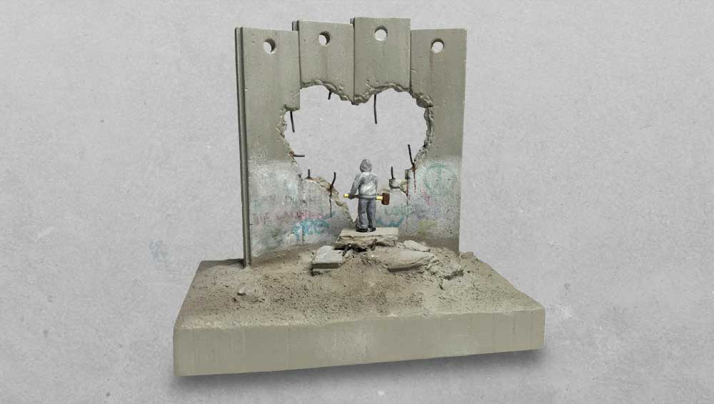 Just when we were about to let you know that Banksy's Walled Off Hotel recently released a music album, Bethlehem's most famous hospitality business also unveiled a brand new souvenir series. Depicting a hooded writer tagging the torn down wall, or tearing it down himself, the new series portrays a long-time dream of many locals that live around the despised structure. Now including a watchtower element, they are an elaborate and much more serious version of Banksy's legendary wall sections released a couple of months ago. Each different, and hand painted by local artists, these souvenirs are produced by the hotel and available for hotel visitors only.