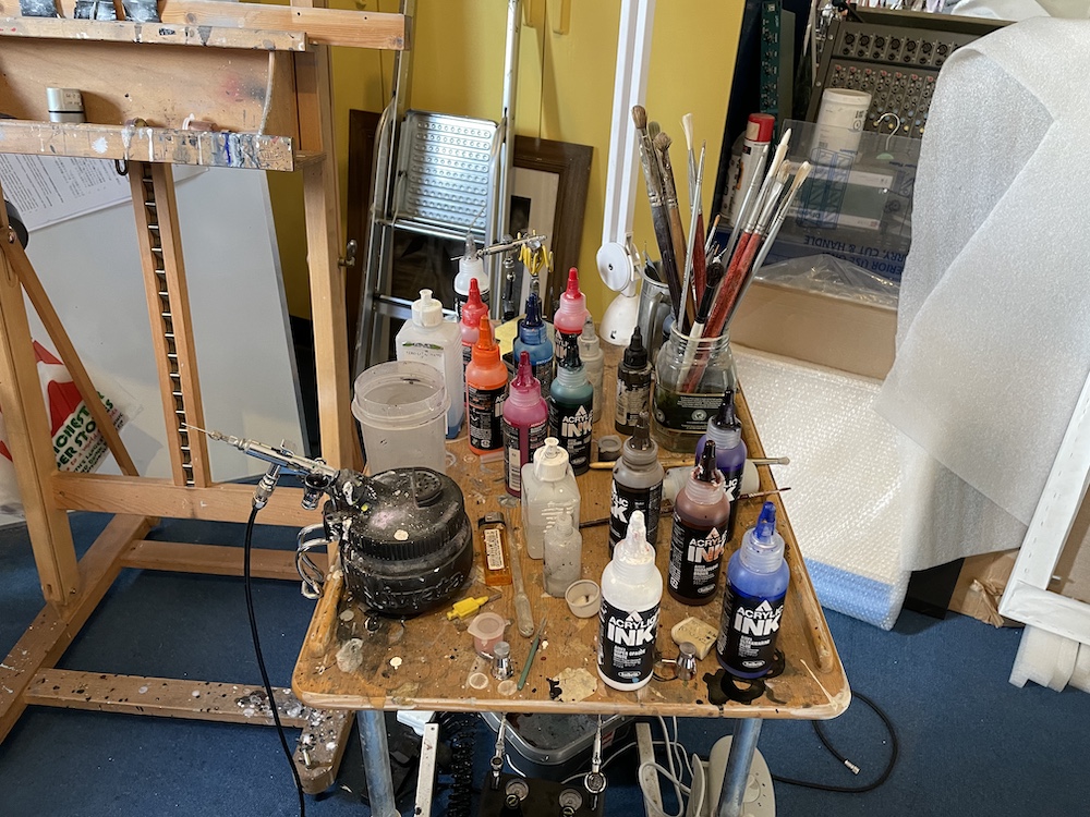 "My studio at the moment is in my house here, so I work 10-hour days, and it's great to be able to roll out of bed and go straight to the studio—I can work right up until dinner is on the table. I've been learning as I move through the year, and at this point have settled into a routine. I start at 9am and work through to 8 or 9pm, stopping only for tea or coffee breaks, as well as a walk in the park. My preference is to work on one analogue piece at a time while simultaneously developing the next digital reference piece on my computer during tea breaks. I work six-and-a-half days a week. I use a particular brand of acrylic paint which has unique properties and for which there is only one supplier in Europe. It's a minor disaster when I run out of titanium white, so now I buy four bottles at a time!